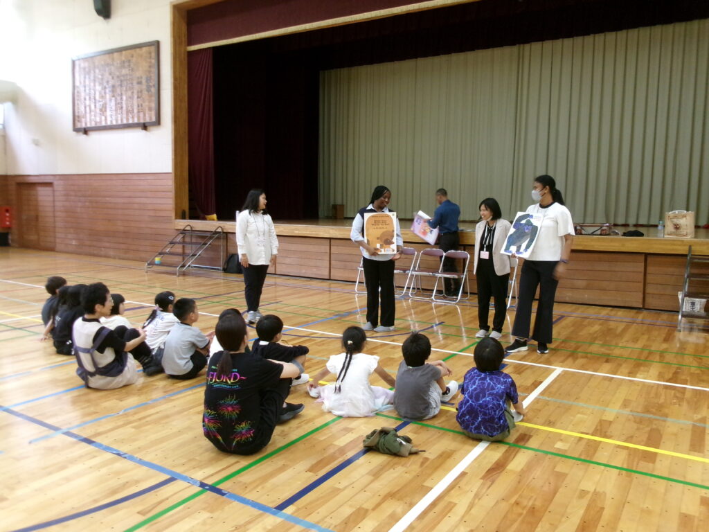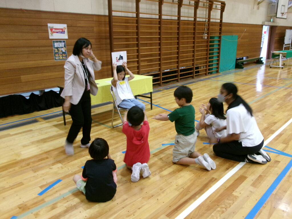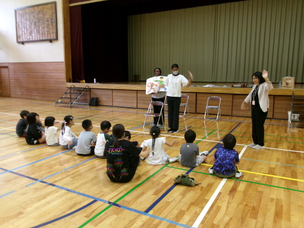 1年生は、“Can you do it?”や“What do you see?”など、本の読み聞かせをしてもらいました。「できますか?」と聞かれた動きをしたり、絵本にでてきた動物を英語で言ったりできました。