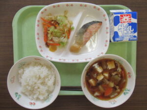 本日は奥多摩中学校2年生が考えてくれたメニューです。これぞ和食!な献立でした。主食(ごはん)、主菜(鮭の西京焼き)、副菜(キャベツと人参のお浸し)、汁物(奥多摩汁)がそろったバランスの良い一食になりました。