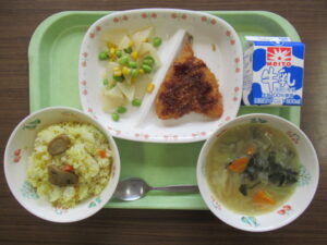 カレーピラフは、具を炒めて作り、炊けた白飯にまぜこんで作るスタイルです。少し味が薄いと感じる方もいると思いますが、学校給食には塩分の基準もあるため、ギリギリで調整しています。おかずのあじフライと一緒に食べるとちょうどよくなりますね。
