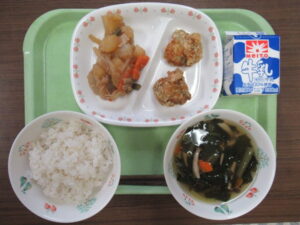 鶏の青のり揚げは、鶏のむね肉を使用しており、さっぱりといただけます。にんにく・しょうが・うすくちしょうゆ・酒・あおのりに漬け込んで、片栗粉をまぶして揚げます。揚げ物をするときは、指先に油がはねて熱いこともあります。調理員さんは1時間30分くらいかけて600個ほどのから揚げを揚げています。