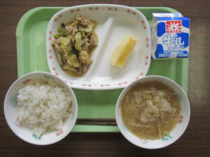 季節の果物、りんごが登場しました。このりんごは、「秋映(あきばえ)」という品種で、長野県で採れました。パリパリとした食感で、甘酸っぱくてりんごらしい味わいでした。皮の色は茶色っぽく、濃い赤色なのが特徴です。
