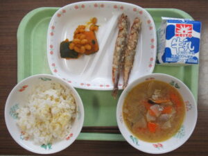 本日はアイヌ(北海道に昔から住んでいた先住民)の食文化を再現した献立です。奥多摩中学校では、自然との共生と畏敬の念」を今も大切にしているアイヌと、オーストラリアの先住民・アボリジナルへの理解を深めることで、人権尊重と国際理解の重要性について学んでいます。